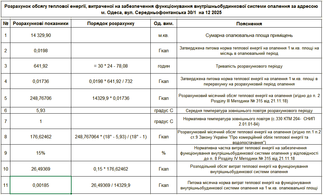 ☝ * Розрахунок обсягу теплової енергії, витраченої на забезпечення функціонування внутрішньобудинкових систем опалення за адресою вул. Середньофонтанська 30/1 на грудень 2025 р.