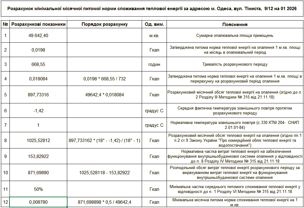 ☝ Розрахунок мінімальної місячної питомої норми споживання теплової енергії за адресою вул.Тіниста 9/12 на січень 2026 р.